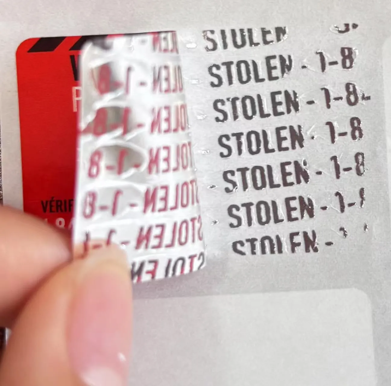 3. كشف النقاب عن علامة مضادة لمكافحة التزوير :كما أنها علامة مضادة للانتعاش لمرة واحدة. عند فتح الملصق - سيتم ترك نمط أو نص محدد على الطبقة السفلية ، مما يشير إلى أنه تم فتح الملصق ومنعه من إعادة استخدامه - إضافة طبقة إضافية من الأمان للمنتج. على سبيل المثال , بعد فتحه-قد يعرض الكلمات "فتح" أو النمط الخاص بالعلامة التجارية.