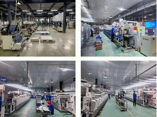 تمتلك شركة JoJo Pack Company مصنعًا يغطي مساحة تبلغ 18000 متر مربع ، مع 7 خطوط إنتاج تلقائية بالكامل ، مزودة بسلسلة من المعدات المتقدمة مثل آلات الطباعة CMYK ، وآلات الطباعة الرقمية ، وآلات التزحلق ، وآلات الترجيح ، وآلات الختم الساخنة ، وقطاعات الورق. سواء كانت مؤسسة كبيرة أو مؤسسة صغيرة ومتوسطة الحجم ، يمكننا تلبية احتياجاتهم OEM و ODM.