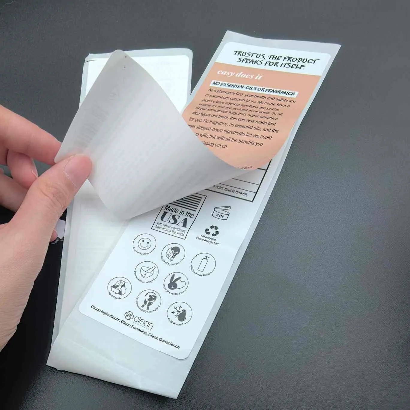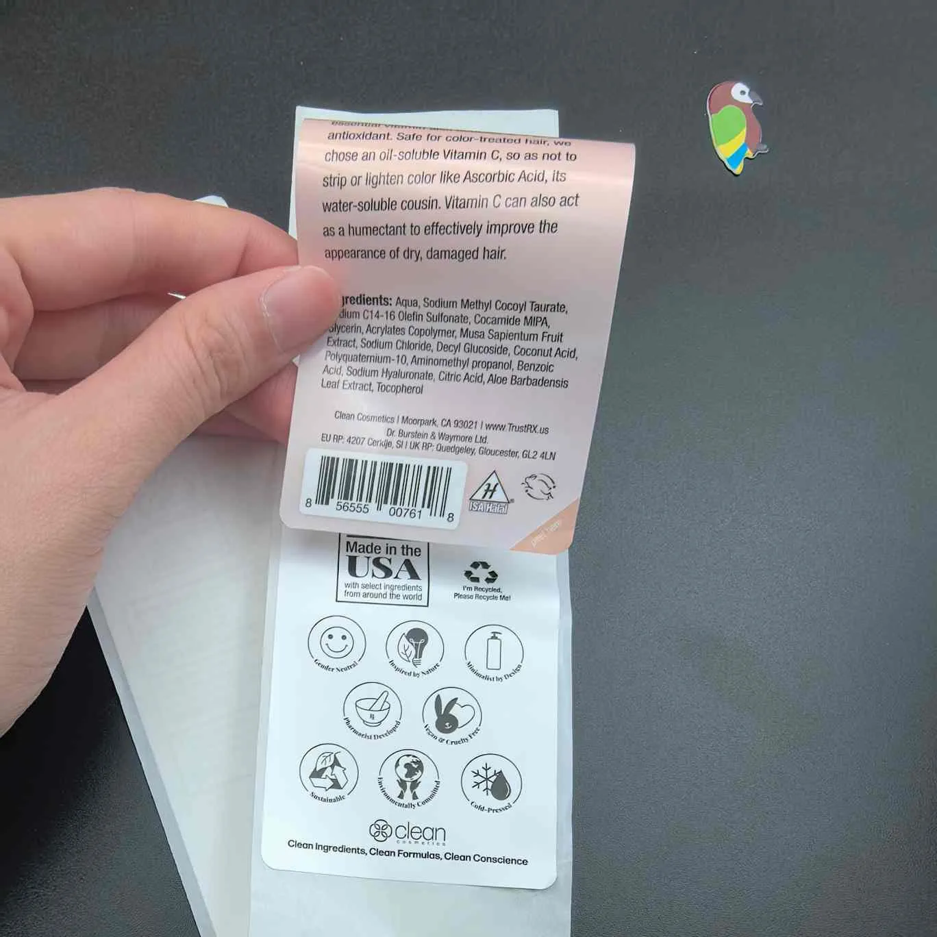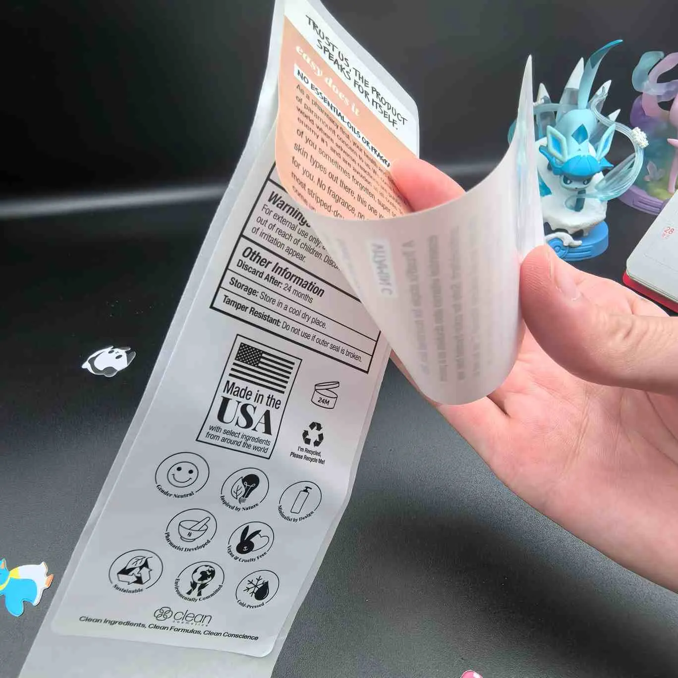 تمتلك مستحضرات التجميل متطلبات تنظيمية صارمة للكشف عن المعلومات، مثل القائمة الإلزامية للمكونات وفقًا للوائح إدارة الغذاء والدواء (FDA) أو الاتحاد الأوروبي. وفي الوقت نفسه، تحتاج العلامات التجارية إلى نقل مفاهيم العلامة التجارية ونقاط بيع المنتج. توازن الطبقات المتعددة لملصقات مستحضرات التجميل بشكل مثالي بين هذين الحاجتين، فهي تتوافق مع اللوائح من خلال حمل معلومات كاملة ومساعدة العلامات التجارية على تعزيز القدرة التنافسية للمنتجات من خلال عرض معلومات منظم وجذاب.