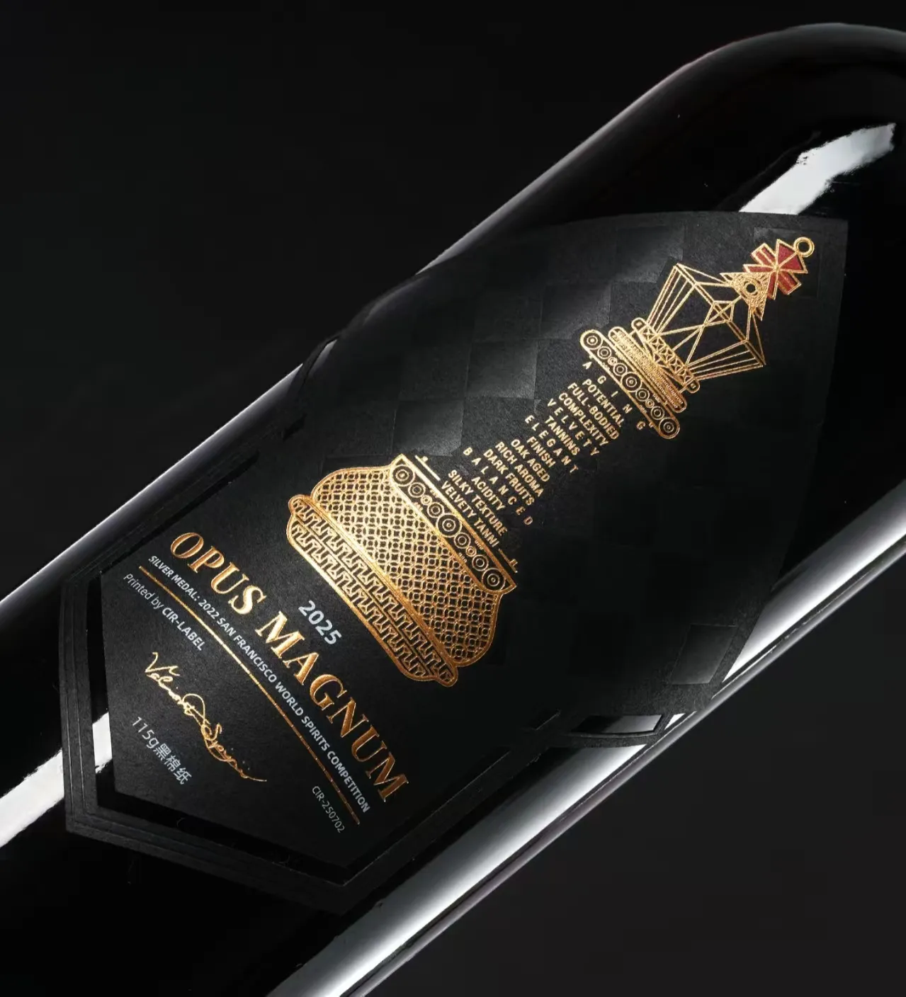 هذاتسمية النبيذيتميز بختم رقائق ذهبية واسعة النطاق. يتم إقران الخلفية السوداء بأنماط الخطوط الذهبية، بينما يستخدم النص مزيجًا من اللونين الذهبي والأبيض. إن سطوع الذهب ولمعان ختم الرقائق المعدنية، جنبًا إلى جنب مع الأنماط والنصوص المرتفعة قليلاً، يخلق تركيزًا وطبقات واضحة، مما يعطي جمالية كلاسيكية وأنيقة.
