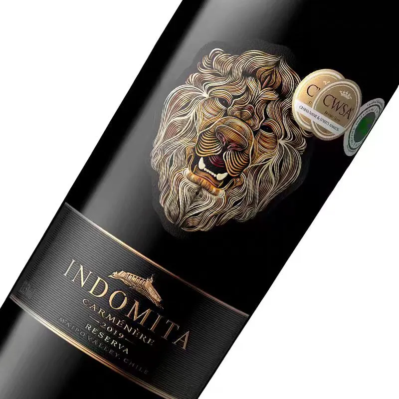 هذاتسمية النبيذيستخدم تصميم الانقسام. يتميز الجزء السفلي بخلفية خطية، بينما تم ختم النص والقلعة والحدود العلوية والسفلية برقائق ذهبية نحاسية عتيقة. يضيف الملمس والألوان المتدرجة لرأس الأسد لمعانًا وتأثيرًا ثلاثي الأبعاد، مما يجعل الملصق بأكمله يبدو مشعًا تحت الضوء ويجذب انتباه المستهلكين.